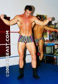 The pose-off between superstars Mike and Mikey and the blonde surfer boys is unforgettable--all four studs pull down their trunks and flex their bare asses! Stripping the surfer twins to sexy speedos, the heels dish out incredible ab punishment and a figure-4 headscissors sleeper. The prettyboys recover to apply double headscissor surfboards inciting the tough vets to ex…See the action now!
