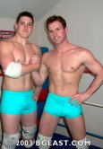Ultimate pro action: babyfaces in blue and matching satin jackets, hot heels in black, leather and shades! Aryx tries to cheat, but the ref won't have it! Wasting time arguing, Aryx gives Jaxx time to recover. When he does, he catches Aryx in midair and drives him to the mat with a devastating swinging side slam. "Last man out/first man in," the ref informs the shell-sho…See the action now!